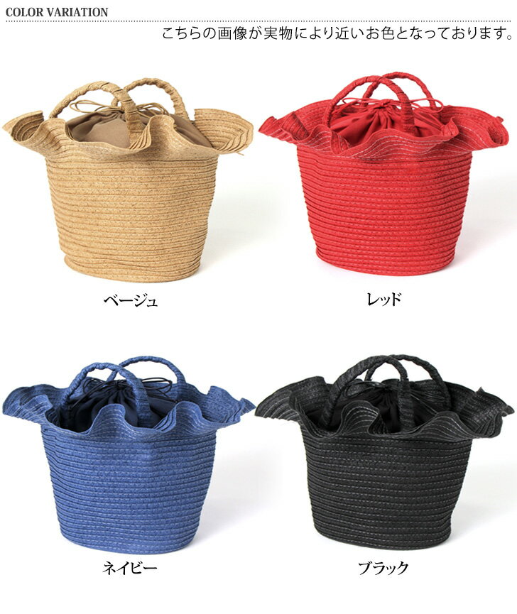 ●季節感あふれるスタイルに仕上がる便利なアイテム!ラッフル ミニトートバッグ ■仕様:フリーポケット×2 ■生産:中国製 素材 分類外繊維(ペーパー) カラー ベージュ(薄めの明るい茶色)レッド(標準的な赤色)ネイビー(青に近い紺色)ブラック(標準的な黒色) サイズ(cm) 縦 上横 下横 マチ 持ち手 重さ(g) - 20 32 22 14 28.5 240 上記サイズ表はスタッフが採寸し、製品の実寸を掲載しております。